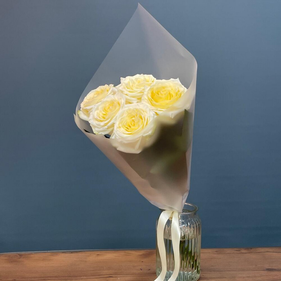 На фото 5 кремовых роз. В составе: роза 5 шт, дизайнерская упаковка 1 шт, атласная лента 1 шт, . Все цветы свежие и ароматные, букет красиво оформлен и отлично подходит для подарка. Доступна доставка цветов или самовывоз.